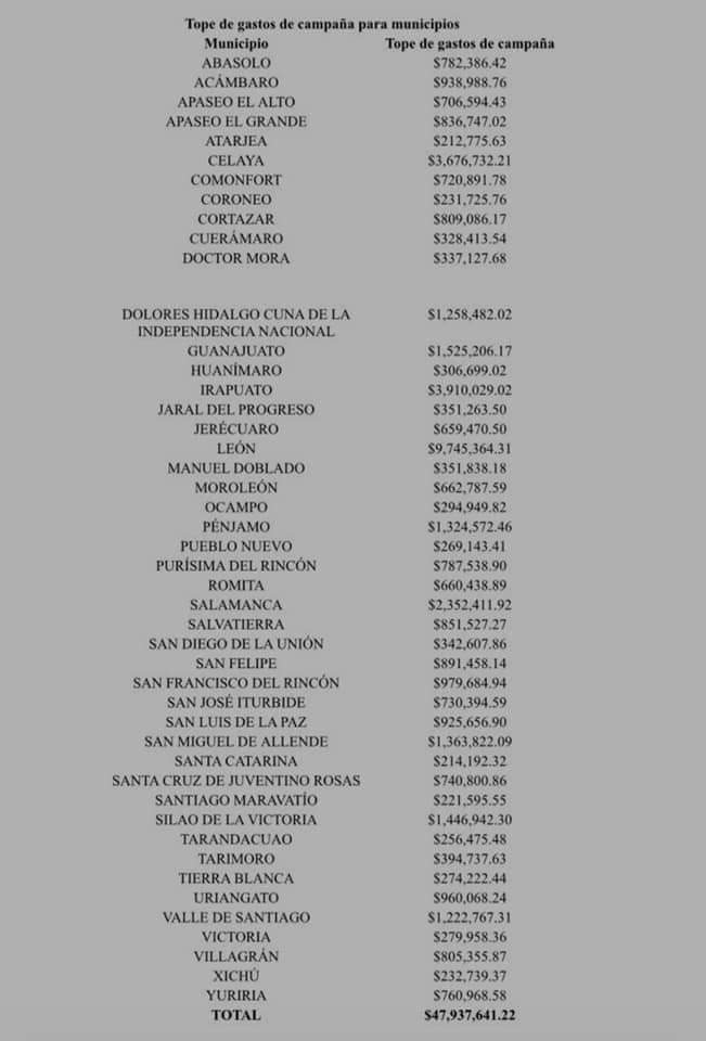 Los municipios con el tope de ejercicio más alto son León con 9 millones 745 mil 364 pesos, Irapuato con 3 millones 910 mil 29 pesos, Celaya con 3 millones 676 mil 732 pesos, Salamanca con 2 millones 352 mil 411 pesos y Silao con un millón 446 mil 942 pesos para los topes de gastos de campaña por candidatos.