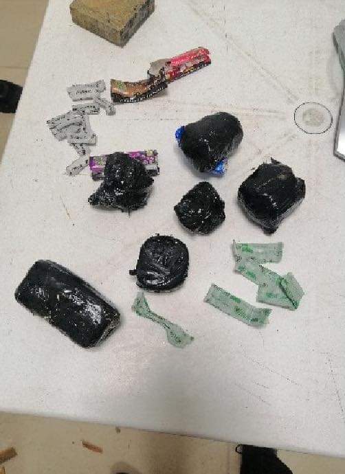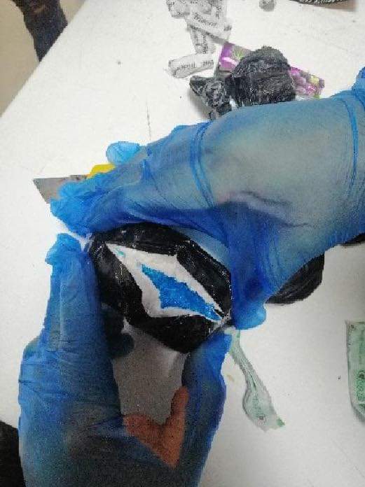 Cinco de estos mismos envoltorios contenían hierba verde y seca con las características de la mariguana, para un total de 215 gramos. El sexto de los envoltorios, contenía una sustancia azul y granulada con las características de la droga conocida como cristal, para un peso de 140 gramos.