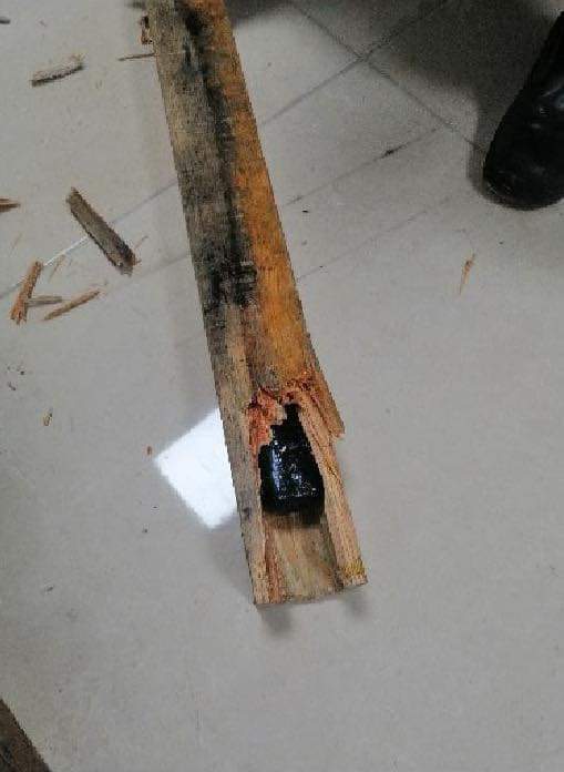 Al pasar por los controles de seguridad de la aduana para la revisión de los maderos a través de la banda de Rayos X, en dos polines se apreció que mostraban un fondo oculto en uno de sus costados, el cual estaba pegado y asegurado con clavos.