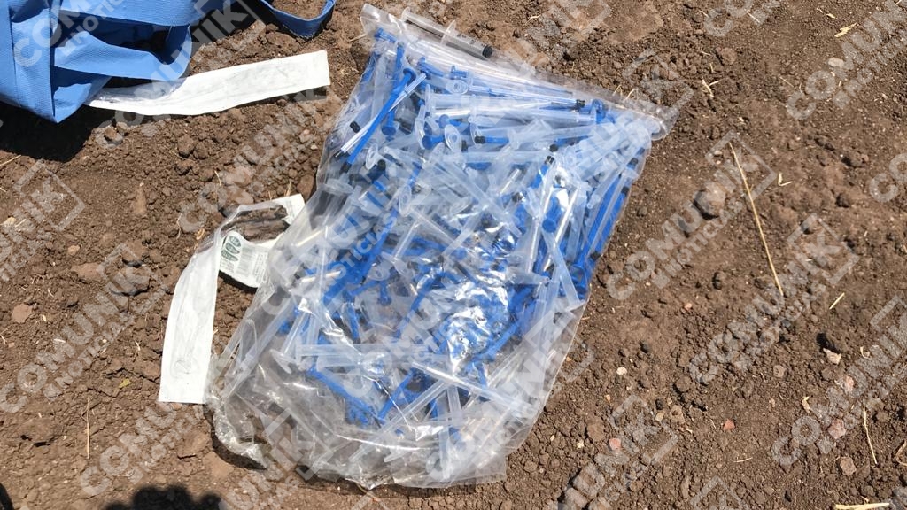 Cientos de jeringas usadas, presuntamente utilizadas para vacunar contra el COVID, aparecen en terreno baldío en Pénjamo