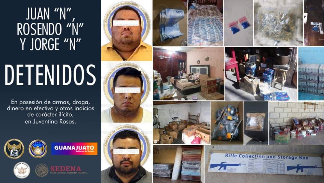 Durante los despliegues operativos de las autoridades estatales y federales, se detuvo a JUAN “N”, director de Tránsito Municipal en Juventino Rosas, ROSENDO “N” y JORGE “N”, en posesión de armas de fuego, droga, dinero en efectivo y diversos indicios de carácter ilícito, por lo que serán puestos a disposición de la autoridad competente.