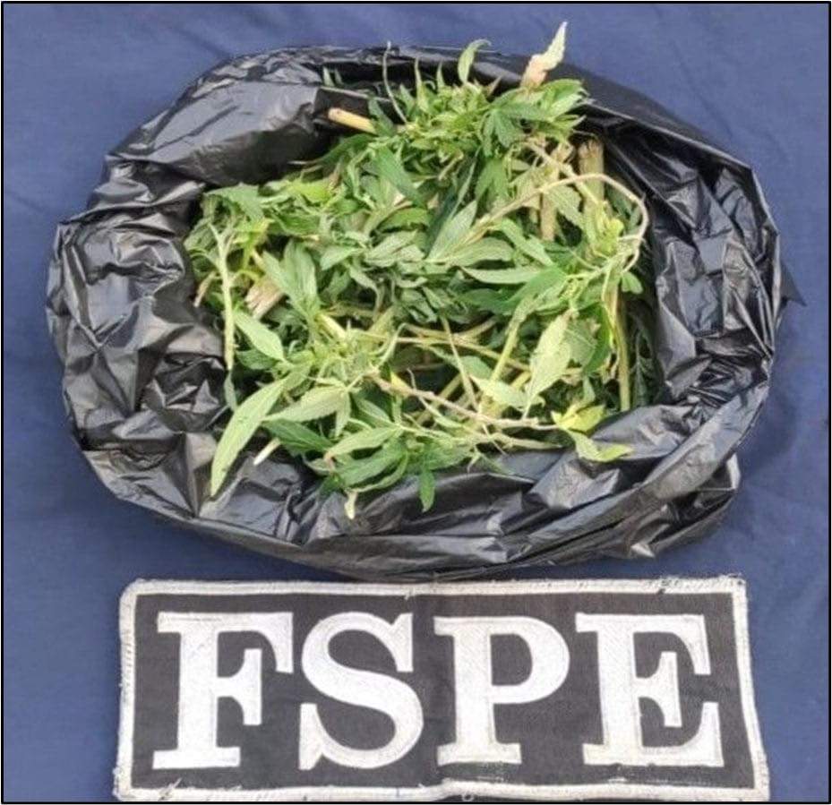Durante la revisión de ese sitio, se localizó al interior de dicha bolsa, una hierba verde con las características de la droga conocida como mariguana, para un aproximado a 110 dosis de esta droga.