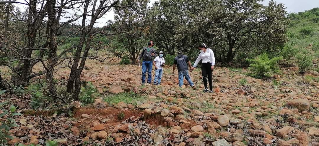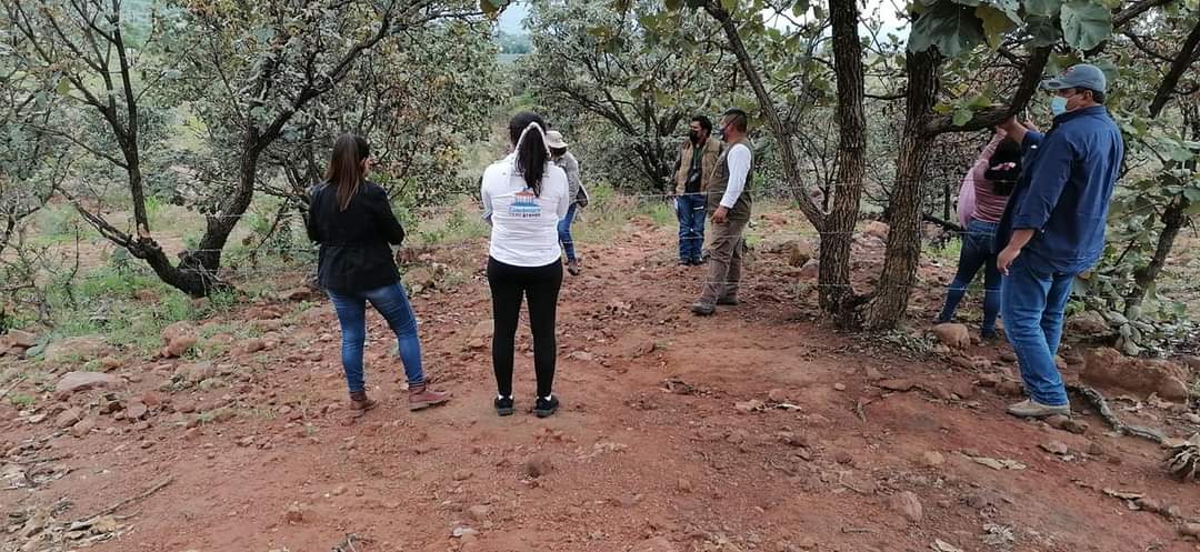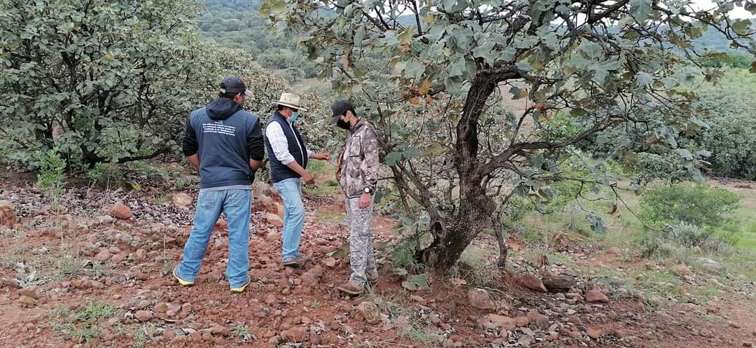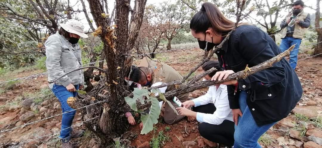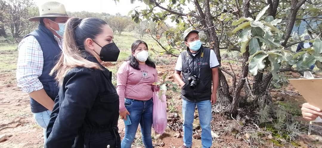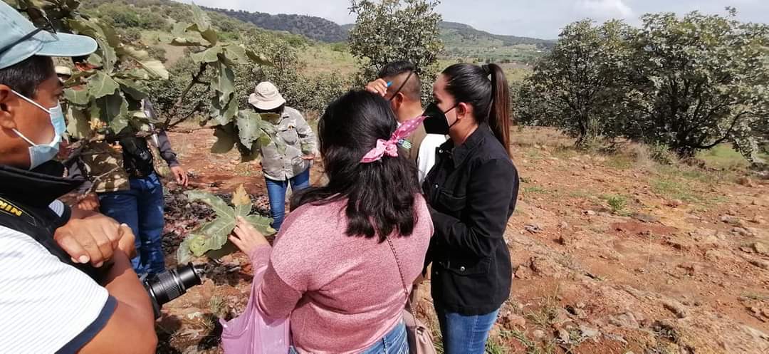 Para hacer una primera visita de inspección y muestreo, este día la alcaldesa Lic. Ana Rosa Bueno Macías; Joaquín Vargas, Presidente del Ejido Cuerámaro; el Ing. Forestal Godofredo Martínez (Área de Sanidad de CONAFOR); Ing Adriana Venegas y el Ing. Felipe Viscaino González, recorrieron la zona de La Regalada y El Zorrillo parte alta de La Puerta de la Reserva para inspeccionar el lugar.