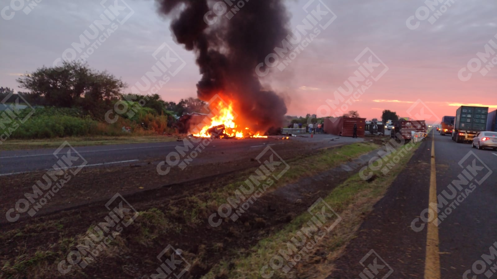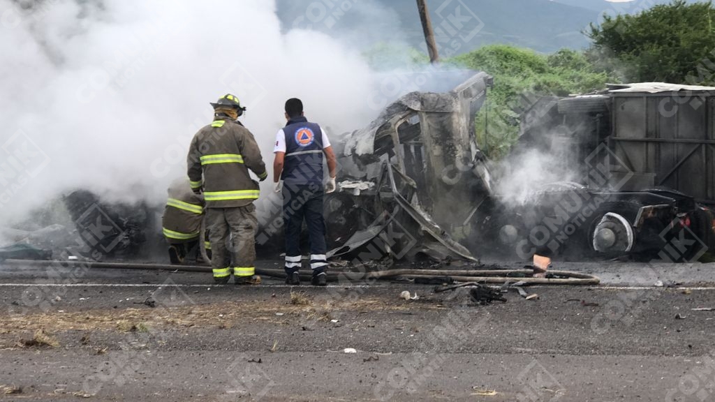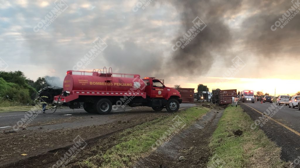 A consecuencia del choque, el tráiler se incendió y su conductor se calcinó dentro de la cabina, elementos de Bomberos de Pénjamo sofocaron la llamas para evitar que se propagaran.