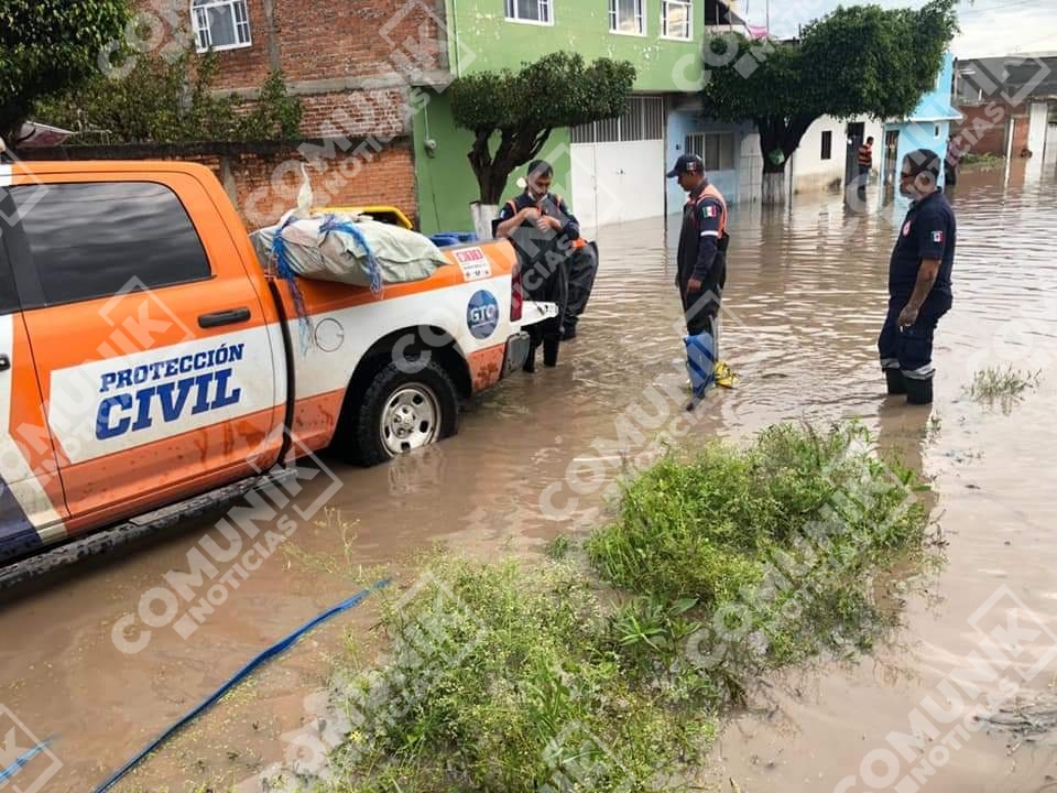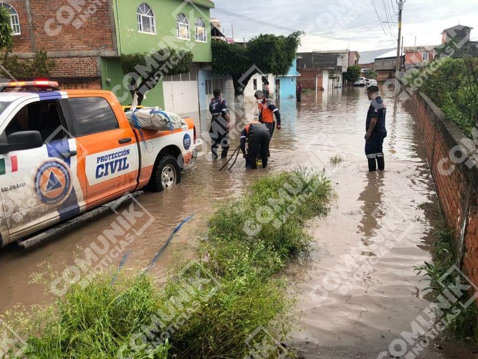 Cuerámaro, Gto.- A consecuencia de una fuerte lluvia que azotó la cabecera municipal de Cuerámaro y varias comunidades rurales, se registró una contingencia por inundaciones en varios sectores del municipio, lo que ha movilizados al personal de Protección Civil Municipal y Estatal, que siguen hasta este momento, sacando el agua de los hogares.