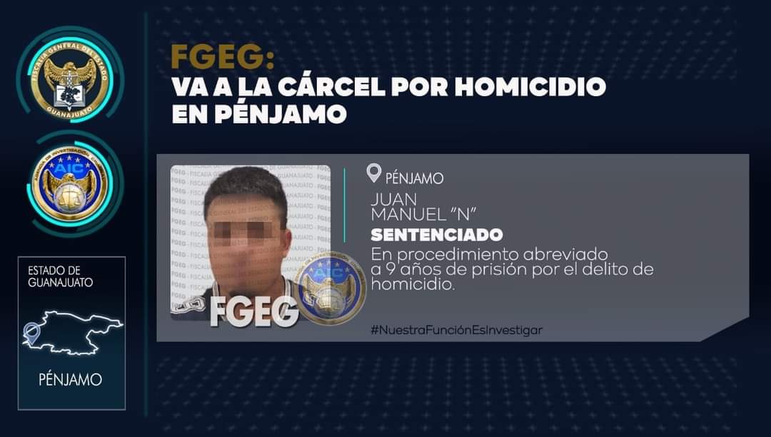 Pénjamo, Guanajuato.- JUAN MANUEL “N“, fue sentenciado a prisión por el asesinato de un hombre que se encontraba en un campo deportivo; la Unidad de Homicidios acreditó su responsabilidad, le fincó cargos por el crimen cometido, y ante las pruebas se declaró culpable de haber asesinado a Víctor “N” el 16 de mayo del 2021, en la ciudad de Pénjamo.