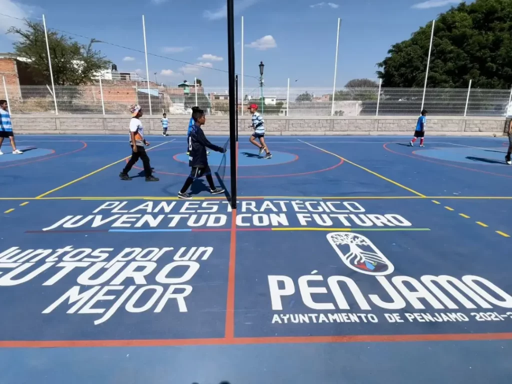 Pénjamo, Guanajuato.- Los niños de la escuela de fútbol Los Sabinitos, las familias de la zona y el alcalde Goyo Mendoza, fueron los encargados de inaugurar la nueva cancha de usos múltiples ubicada en el callejón Jalisco, a espaldas del Templo de los Remedios, en Cabecera Municipal.