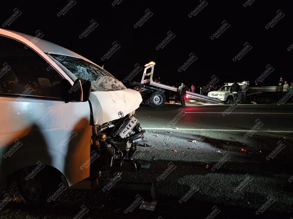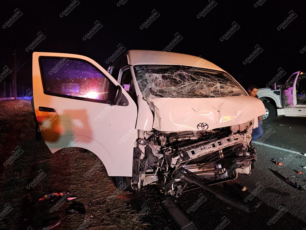 En ese momento fue impactado por alcance por la camioneta de transporte de personal que circulaba en la misma dirección. Por la fuerza del choque, la camioneta Luv fue proyectada hacia la barrera metálica de contención, varios de sus tripulantes salieron disparados sobre la carretera.