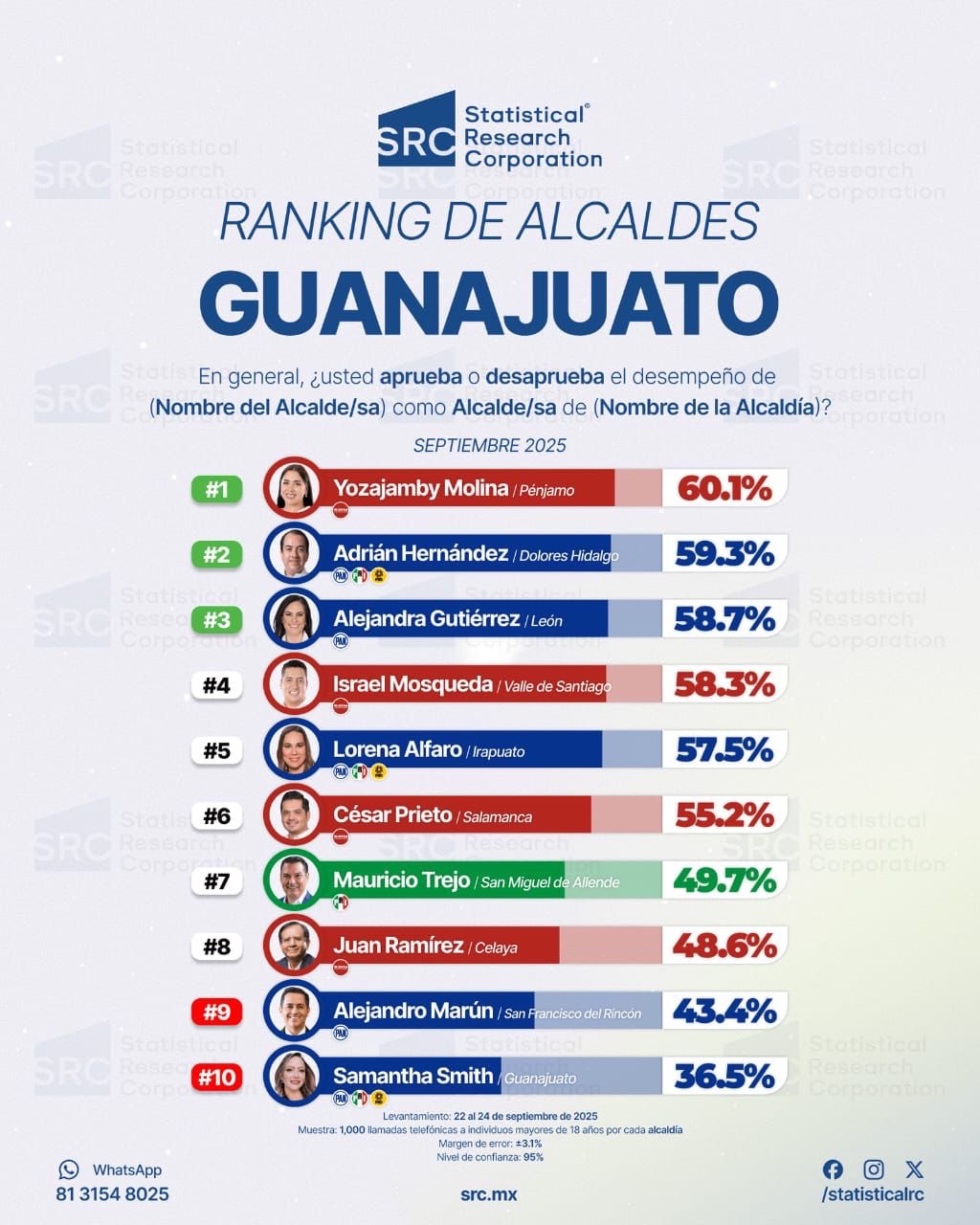 Pénjamo, Gto.- La presidenta municipal de Pénjamo, Yozajamby Molina, se posiciona como la alcaldesa mejor evaluada en todo el estado de Guanajuato, de acuerdo con la encuesta realizada por Statistical Research Corporation (SRC) en septiembre de 2025.