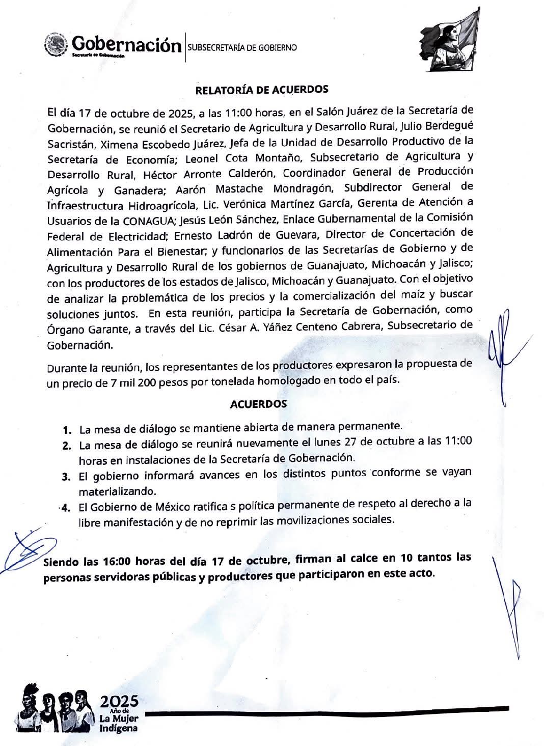 Uno de los principales acuerdos alcanzados fue establecer el próximo 27 de octubre como fecha límite para concretar los compromisos relacionados con el precio de garantía propuesto por los productores, quienes demandan un monto de 7,200 pesos por tonelada, al considerarlo el mínimo necesario para dignificar su trabajo y garantizar la viabilidad del sector.