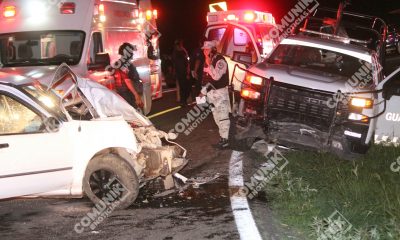 Pénjamo, Guanajuato.- Trece lesionados y miles de pesos en pérdidas materiales, fue el saldo que dejó el choque frontal entre un vehículo particular y una patrulla...