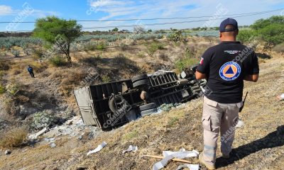 Pénjamo, Guanajuato.- Dos personas lesionadas y cuantiosas pérdidas materiales, fue el saldo que dejó la volcadura de un tráiler cargado con agaves listos para procesar, hechos...